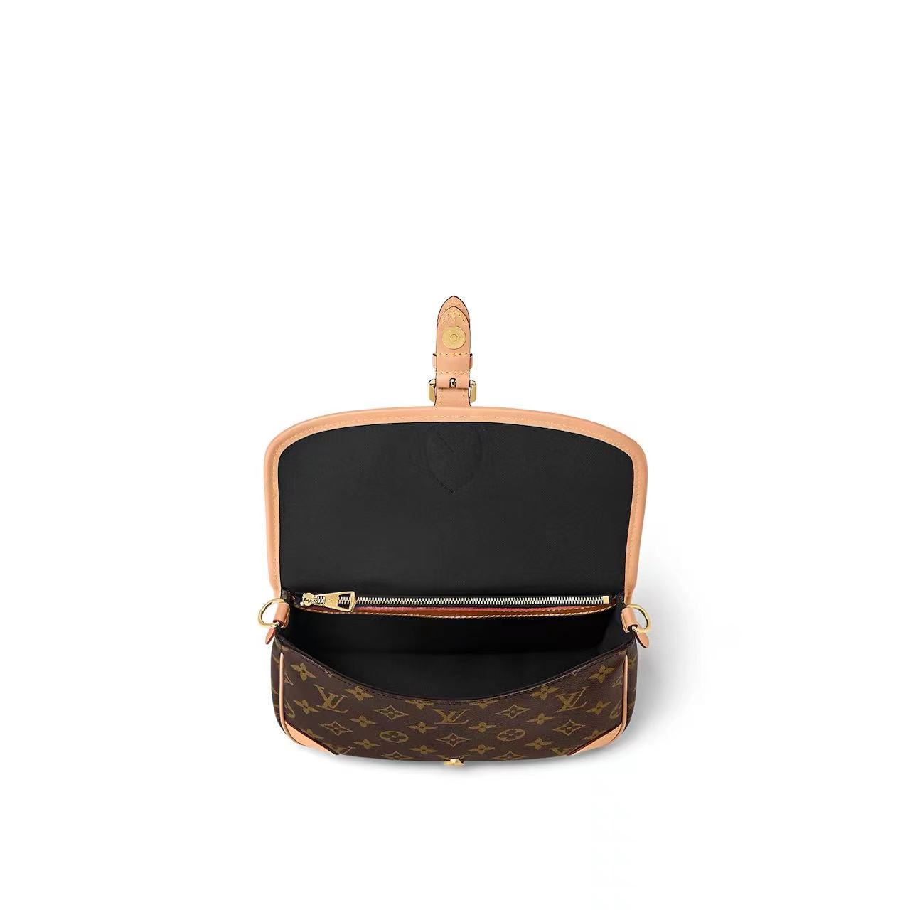 The Diane satchel in Monogram canvas revisits a classic model from the 90s, combining such vintage details as leather corners and an archival-inspired buckle with the modern functionality of smart pockets and a well-organized interior. The exclusive wide jacquard strap reverses from a bold signature to a subtle Monogram Flower motif.