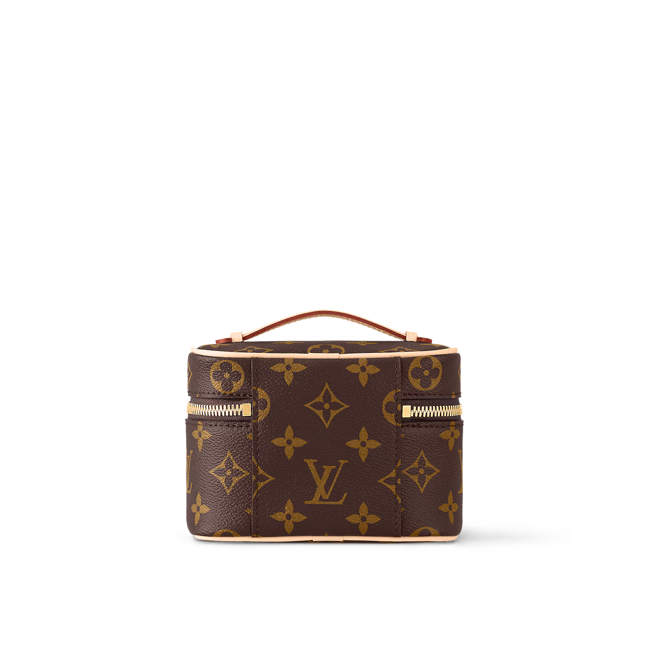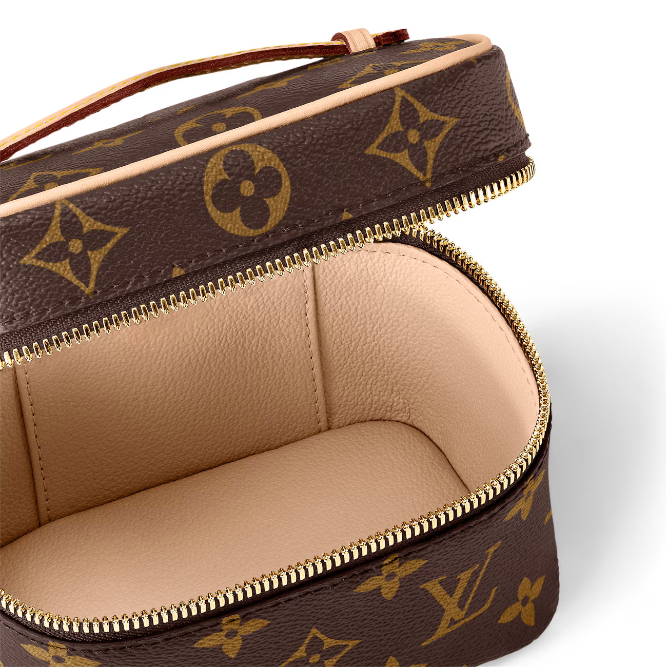 Small and surprisingly roomy, the Nice Nano vanity case can be used to store beauty essentials like nail polish or lipstick in a bathroom, or as a bag inside a bag to keep small items organized. Fashioned from Monogram canvas with a top handle that flattens for easy packing, it easily fits into even tight spaces.