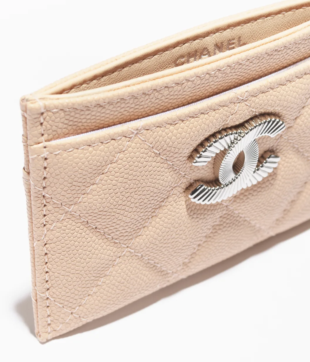 Card Holder Shiny Grained Calfskin & Silver-Tone Metal Beige