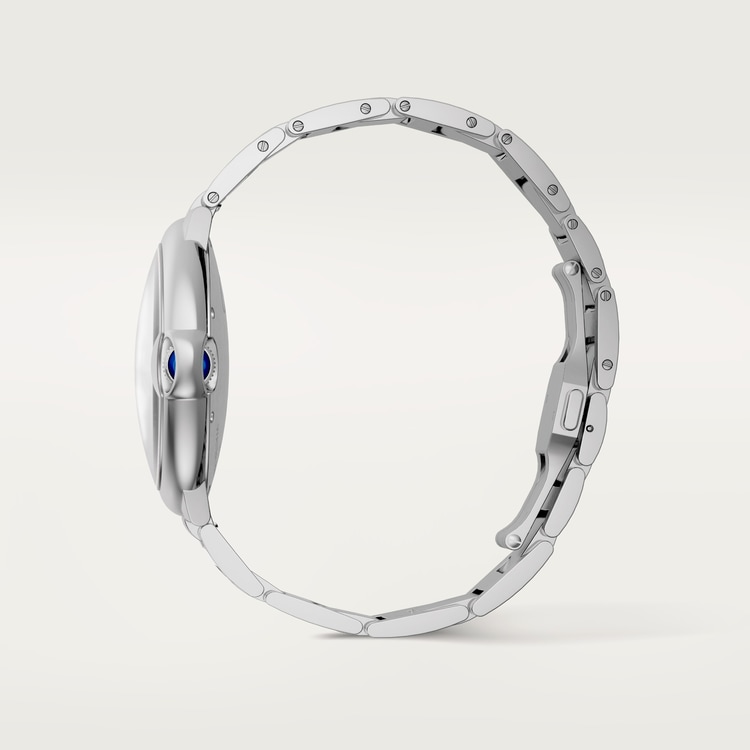 Floating like a balloon and as blue as the cabochon safely nestled in its side, the Ballon Bleu watch by Cartier adds a dash of elegance to male and female wrists alike. Roman numerals are guided on their path by a deep blue winding mechanism. With the convex curves of the case, guilloché dial, sword-shaped hands, and polished or satin-finish links of the bracelet...the Ballon Bleu watch by Cartier floats through the world of Cartier watchmaking.