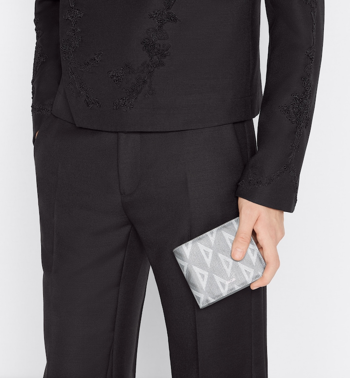 The bifold wallet is a compact accessory with sophisticated appeal. Crafted in Dithtor gray CD Diamond canvas inspired by House archives, it is embellished with tonal smooth calfskin. Its interior features a double bill compartment, two slip pockets and eight card slots. The bifold wallet will fit easily into any pocket or bag.
