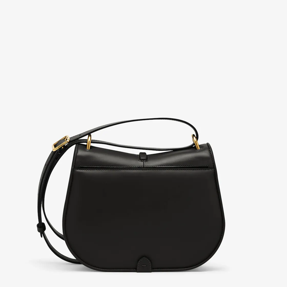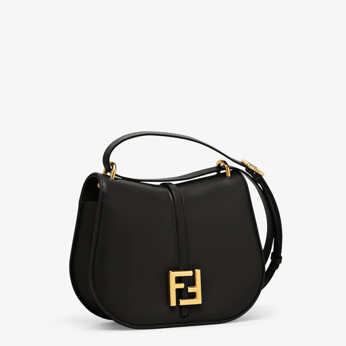Medium satchel bag with curved, feminine lines and an elongated flap embellished with a metal FF logo. Made of smooth black leather with embossed edges and details. The sides of the bag are made from tone-on-tone full-grain leather.