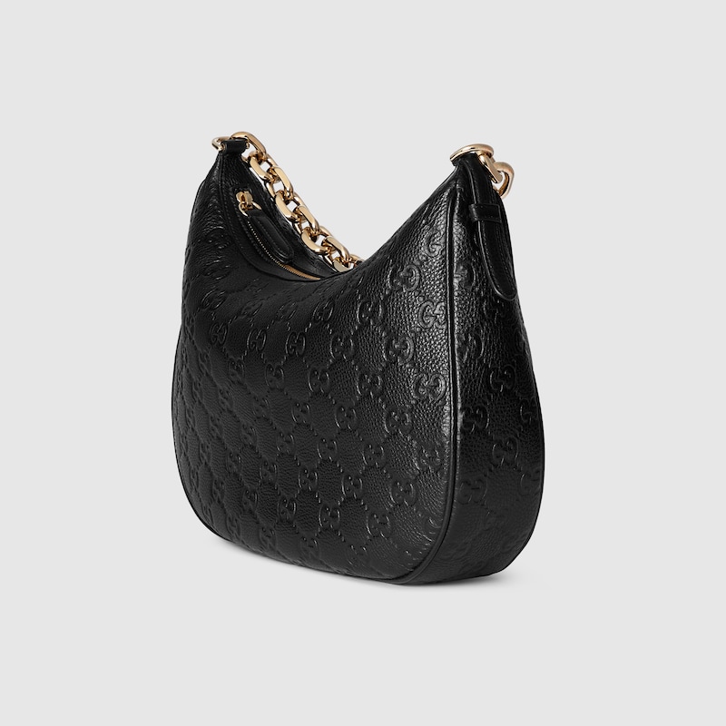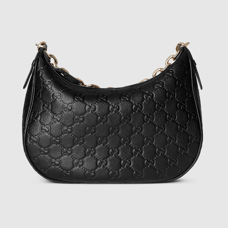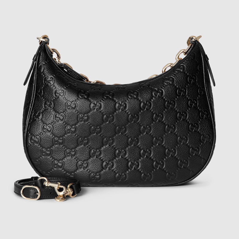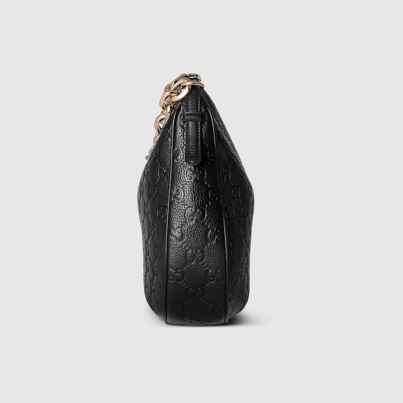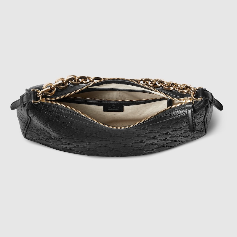 The new GG Emblem collection reinterprets the House’s history of elegance and craftsmanship. This shoulder bag is crafted from GG grainy leather and comes with a chain strap.