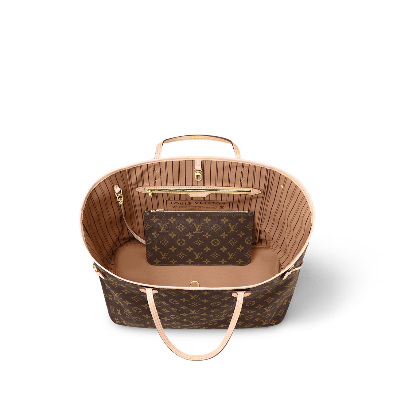 The Neverfull GM tote unites timeless design with heritage details. Made from supple Monogram canvas with natural cowhide trim, it is ultra-roomy but never bulky, with side laces that cinch for a sleek allure or loosen for a more casual look. Slim, comfortable handles slip easily over the shoulder or arm. Lined in colorful textile, it features a removable pouch which can serve as a clutch or an extra pocket.