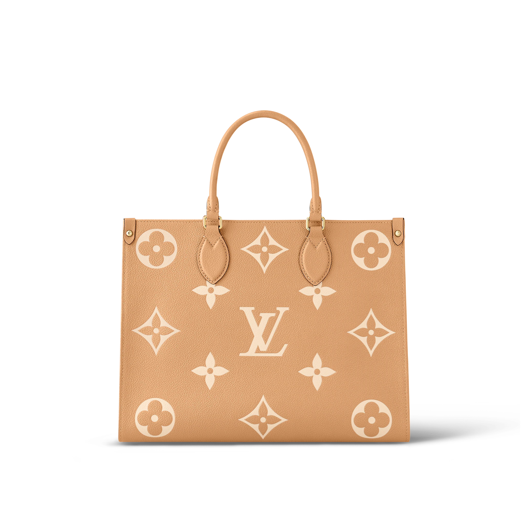 Made from Monogram Empreinte grained leather in a warm two-color combination, this OnTheGo MM tote bag features the Monogram pattern embossed and printed onto the leather. Its boxy shape means its roomy and can easily fit a laptop. It has two leather top handles for hand carry as well as two long shoulder straps.