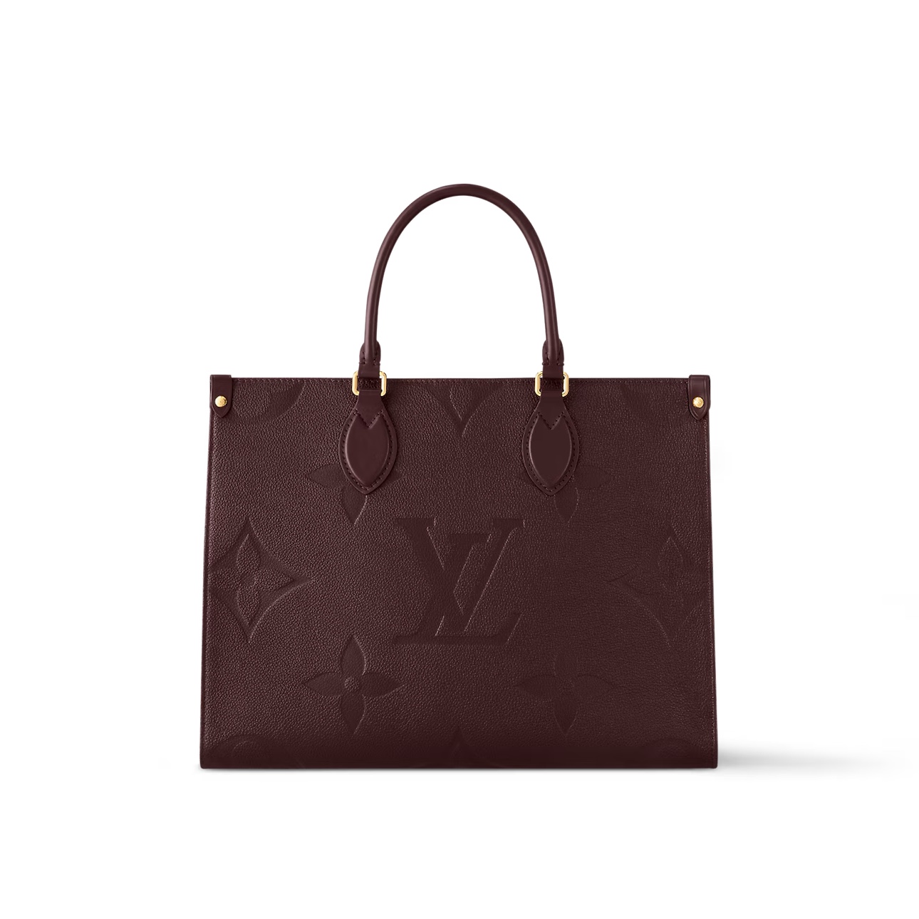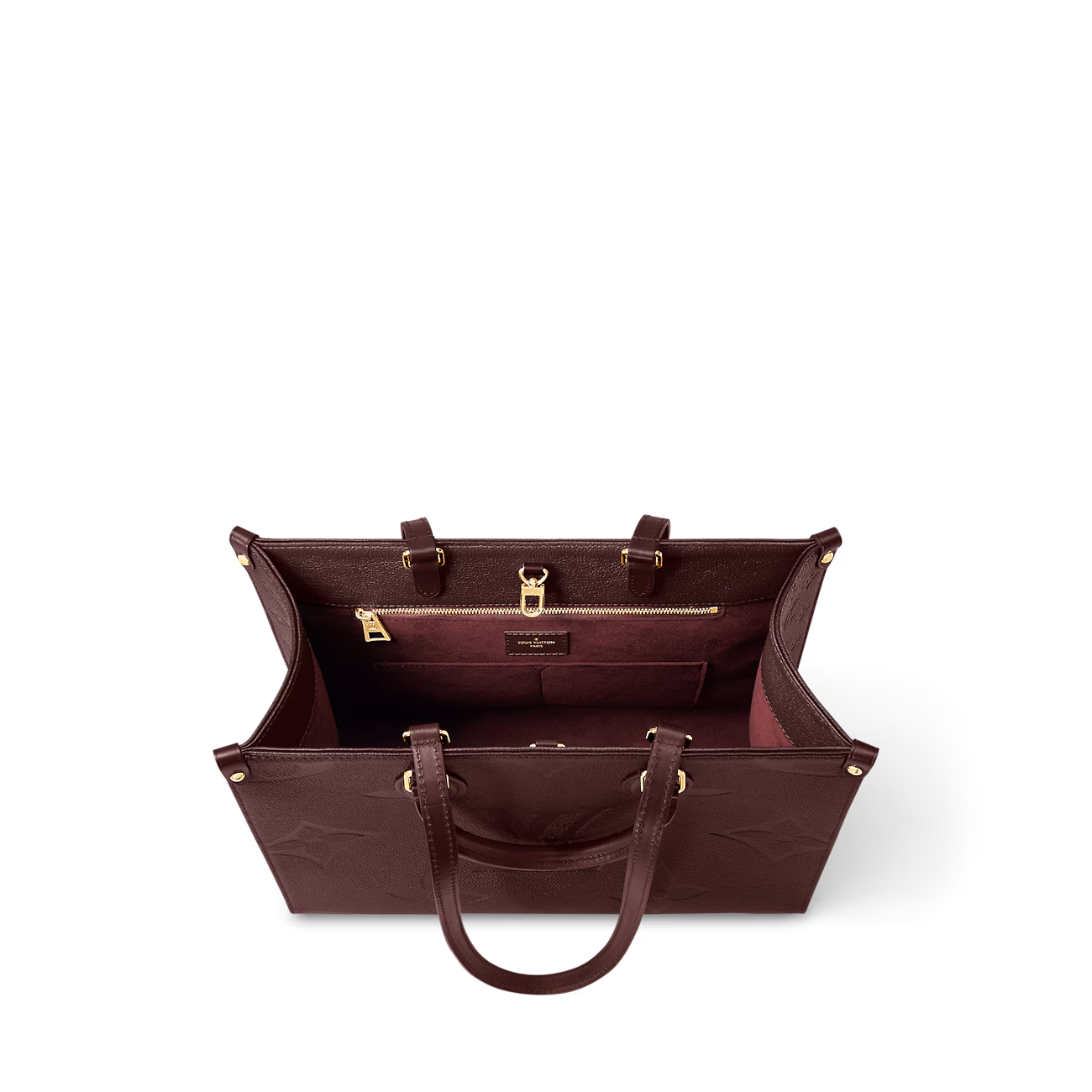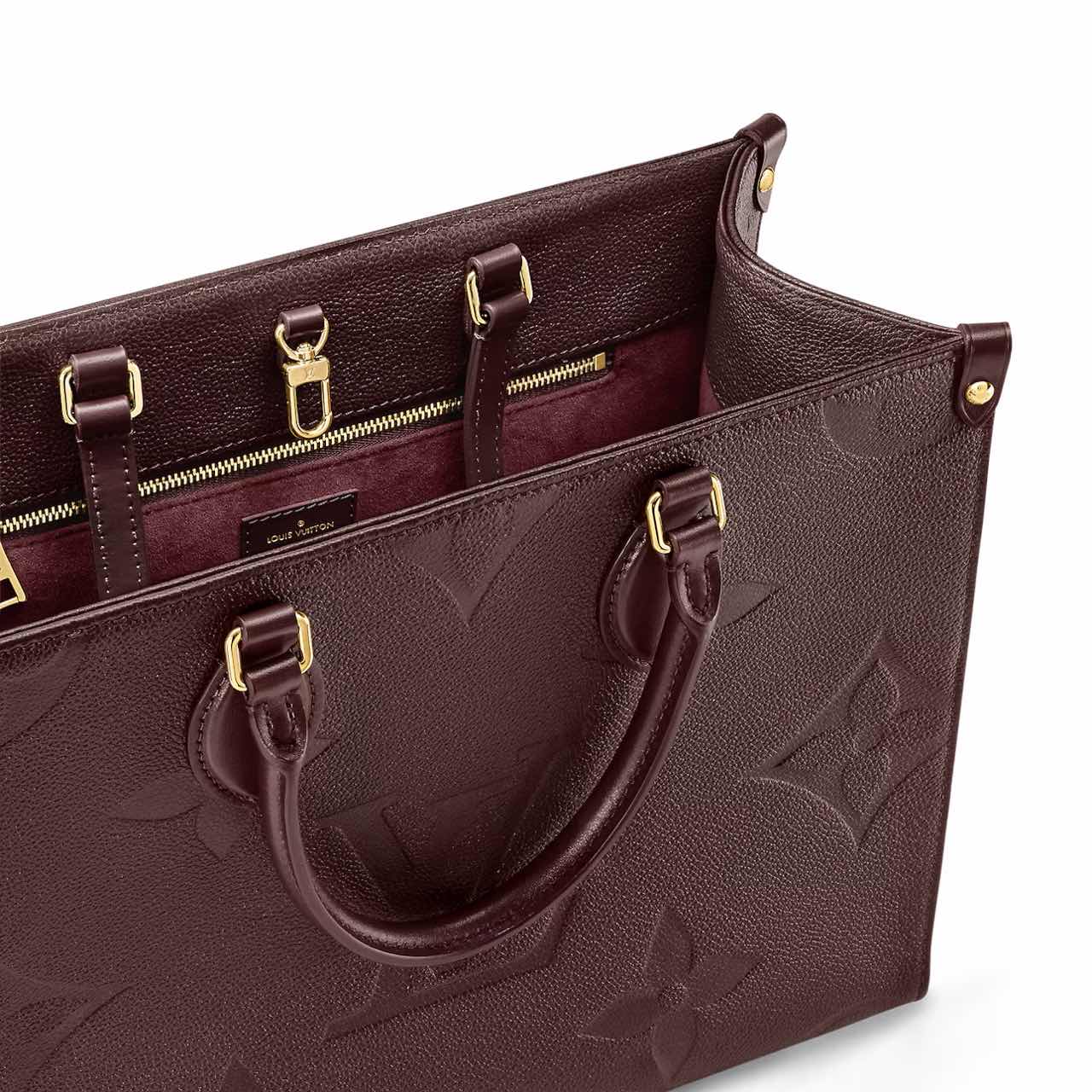 The OnTheGo MM tote is made from grained Monogram Empreinte cowhide leather, a soft leather that is embossed with a large Monogram pattern. Large enough for daily essentials such as a laptop, it features two sets of handles, short and long, for carry options. The inside zipped pocket and two inside flat pockets help keep things organized.