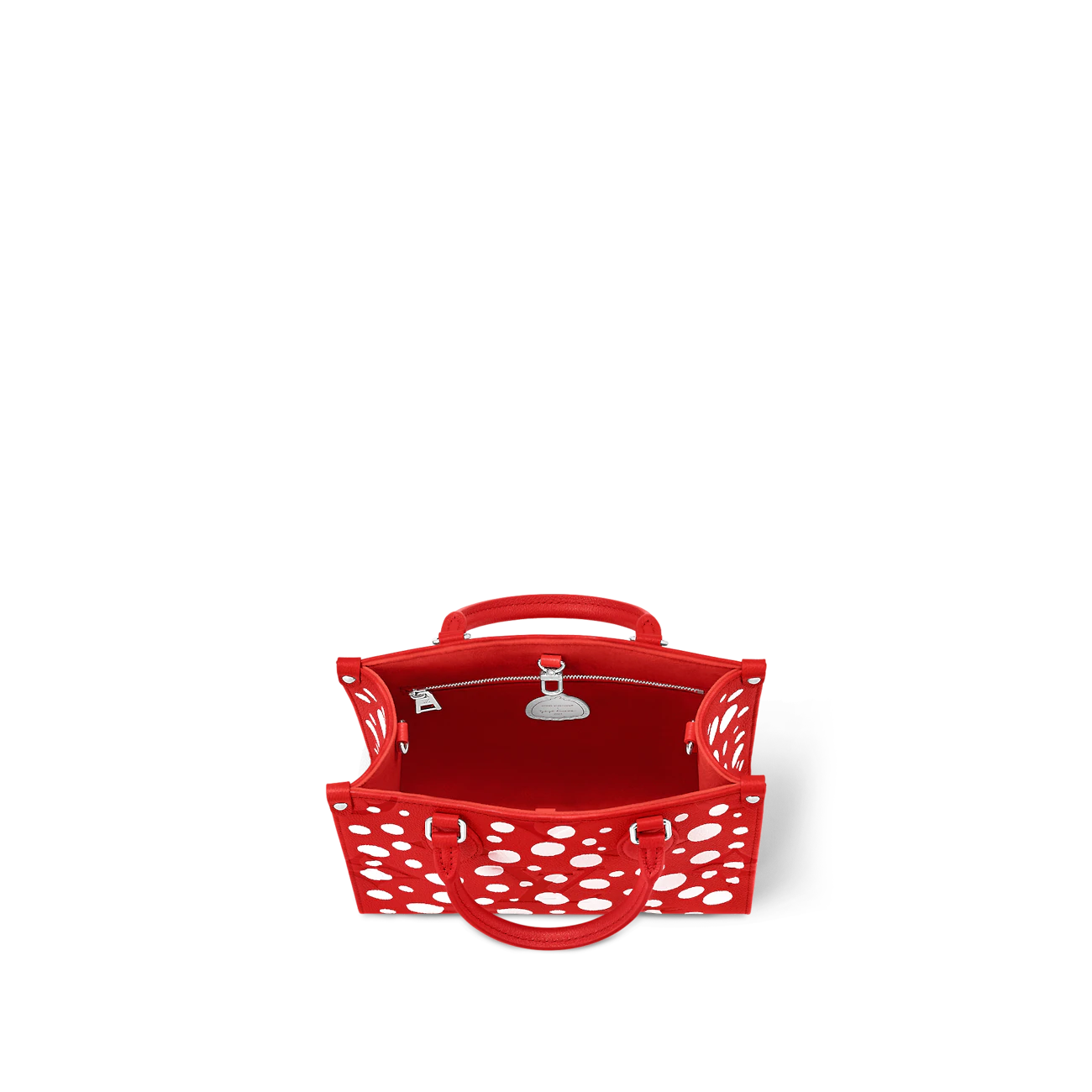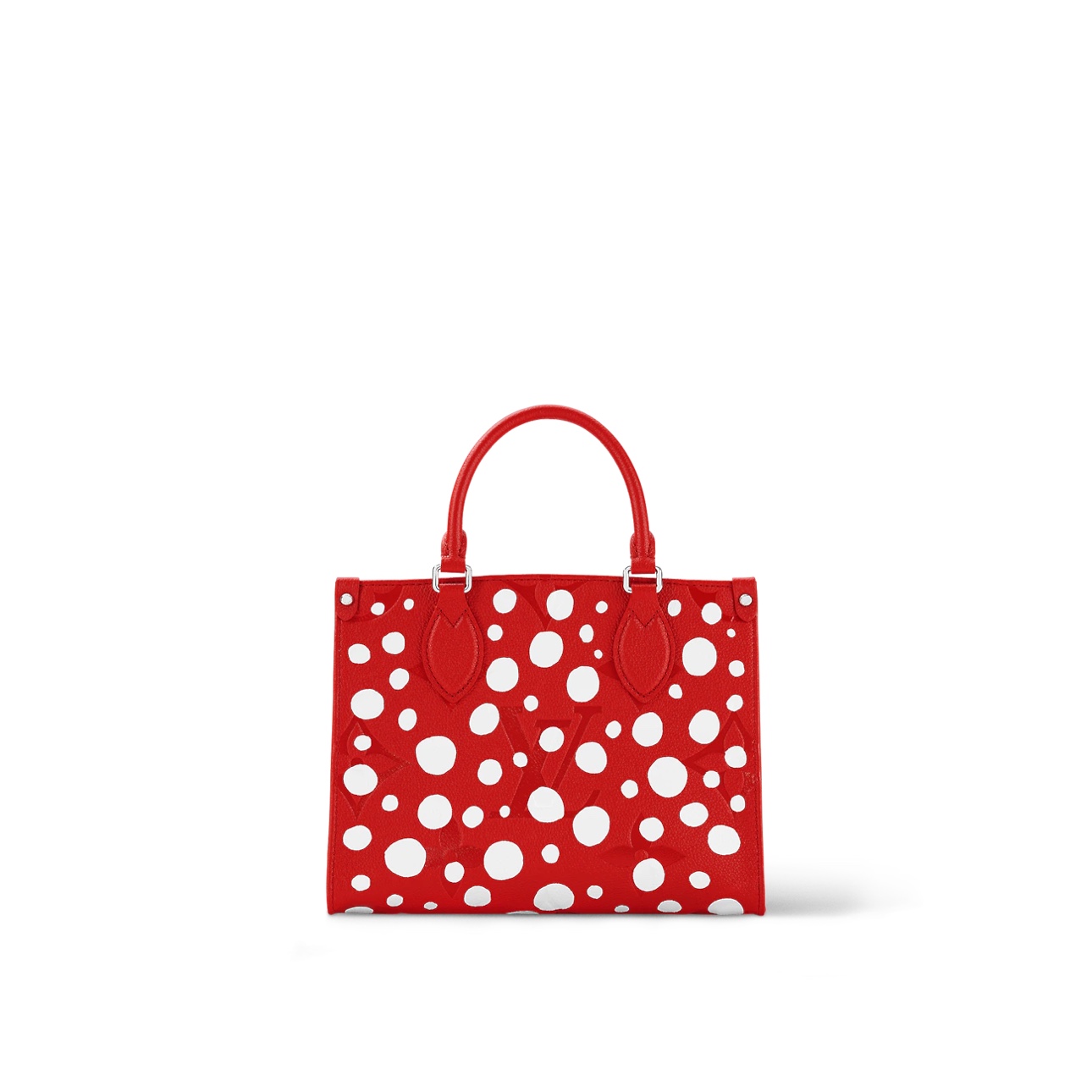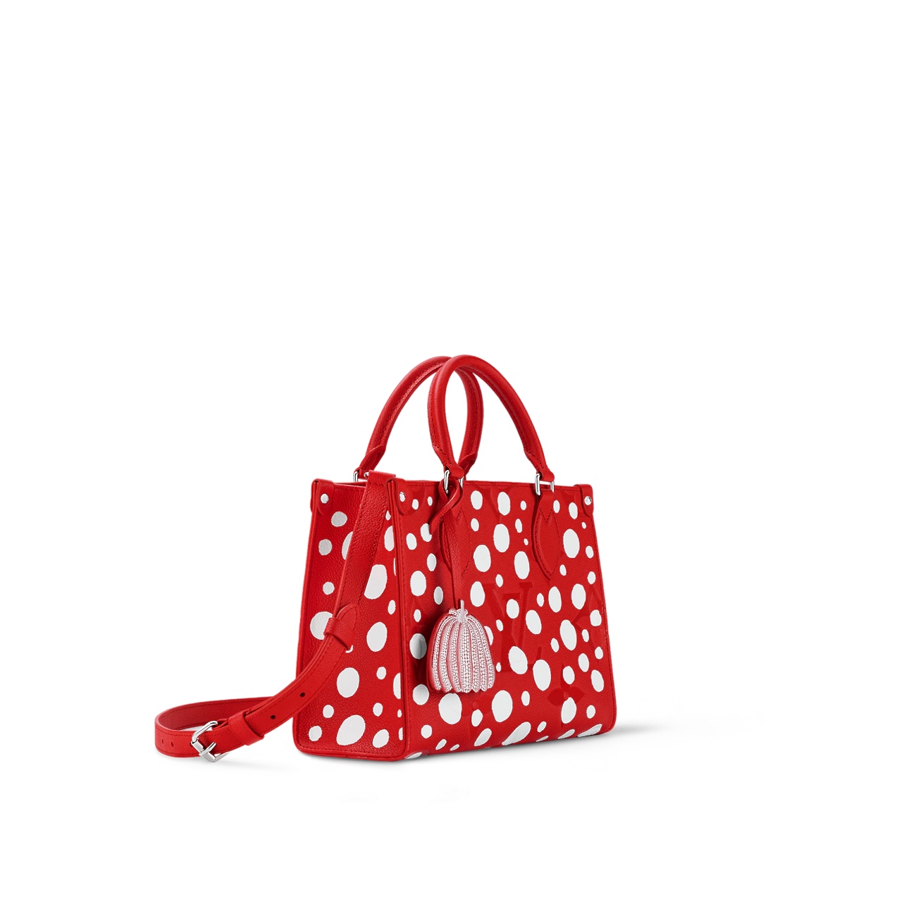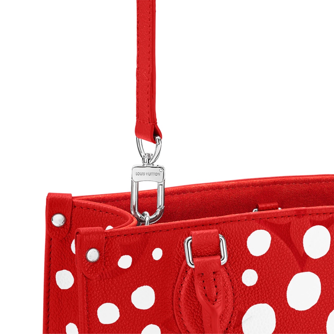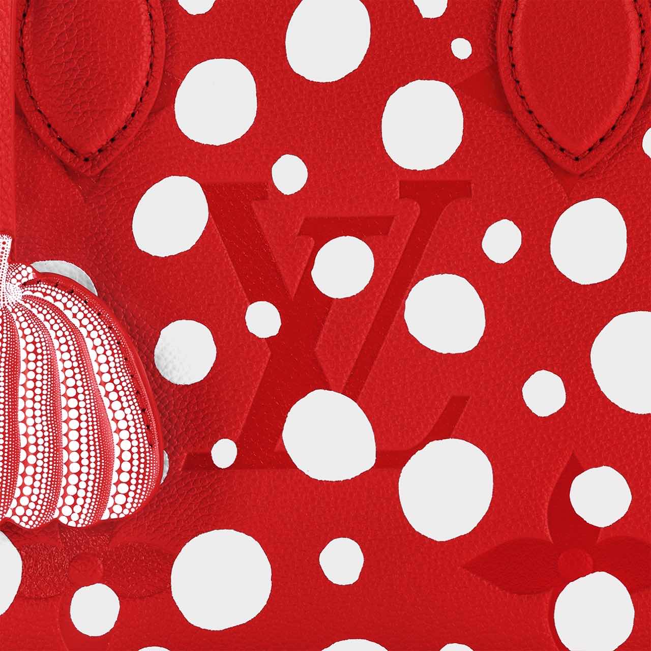For the second L x Yayoi Kusama collaboration, the LxYK OnTheGo PM is enlivened with the Infinity Dots design, a reference to the visionary Japanese artists signature dotted motifs. A constellation of bright white dots is printed on sumptuous cowhide in a vibrant shade of red, embossed with the Houses heritage Monogram pattern. And the pumpkin-shaped charm is inspired by another recurring theme in Kusamas work.