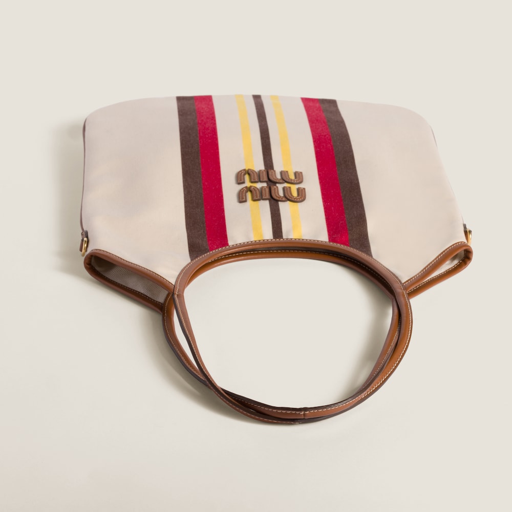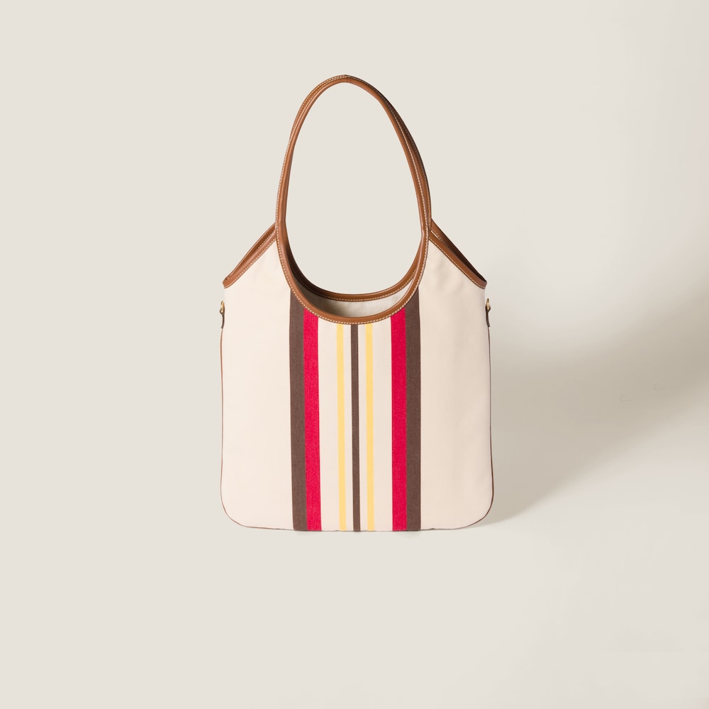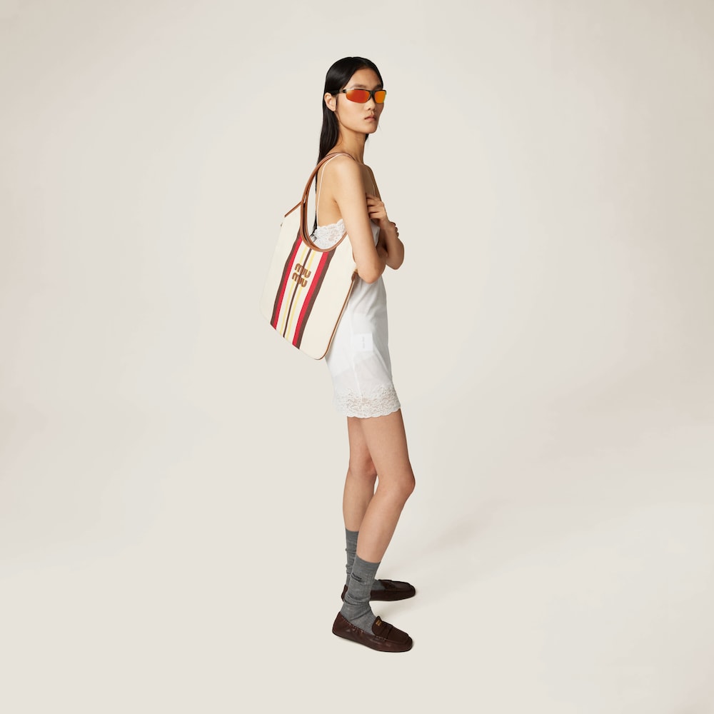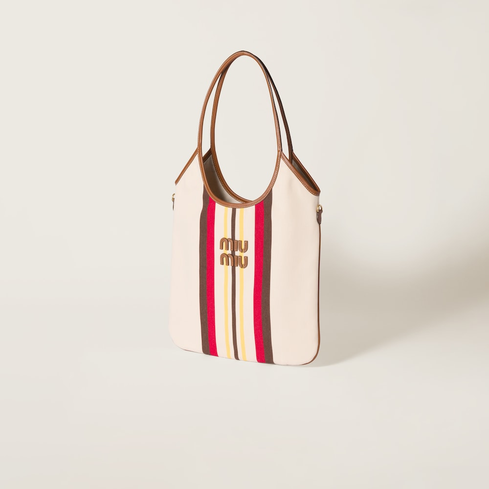 Classic summer hues bring the stripe motif to life, enriching the essence of this IVY bag where the combination of leather and canvas enhances the shape and elegant contrasts of Miu Miu style.