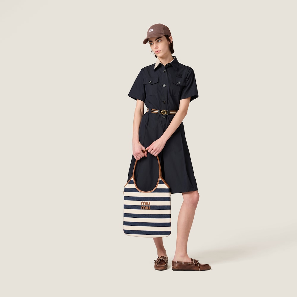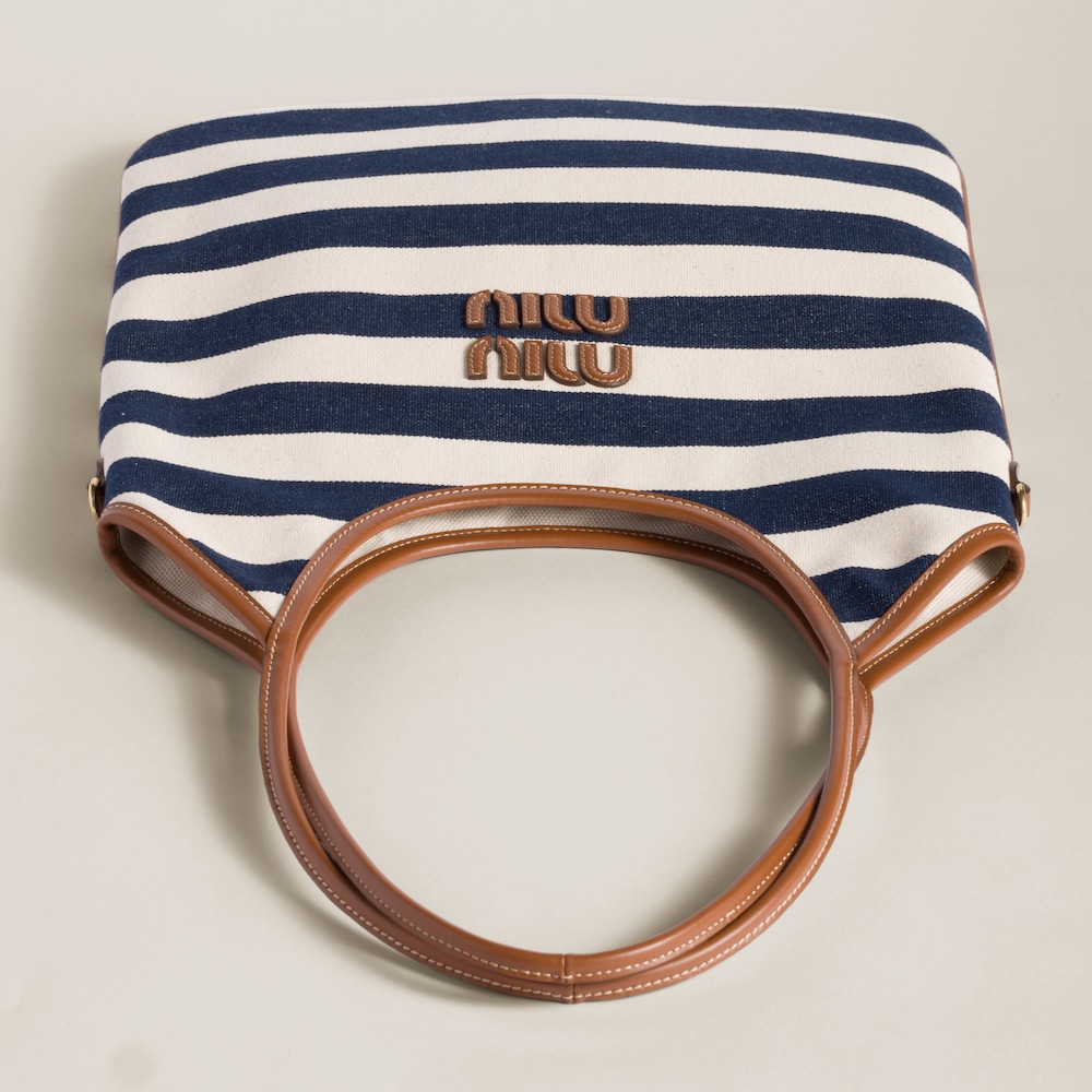 Classic summer hues bring the stripe motif to life, enriching the essence of this IVY bag where the combination of leather and canvas enhances the shape and elegant contrasts of Miu Miu style.