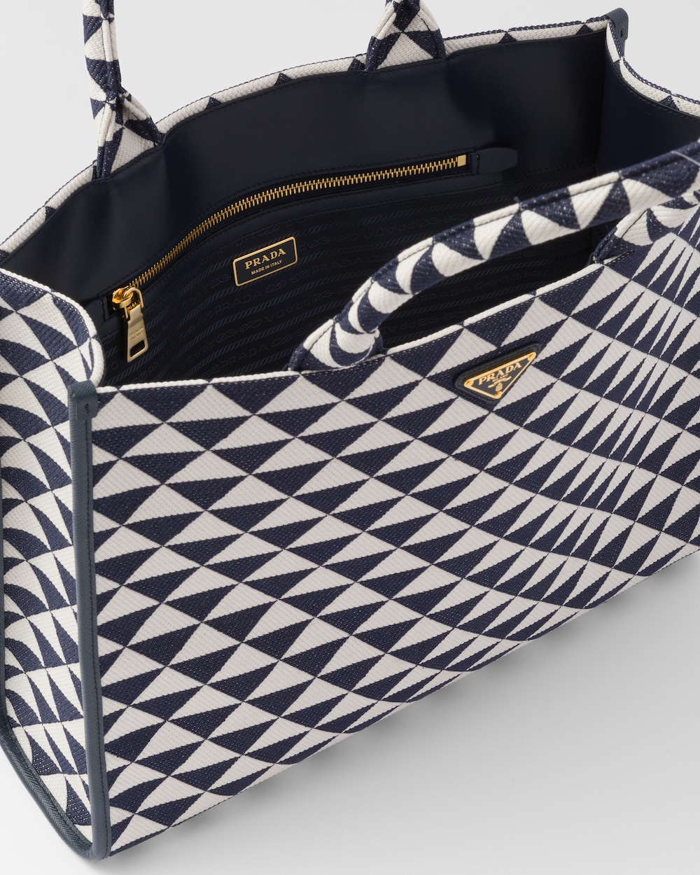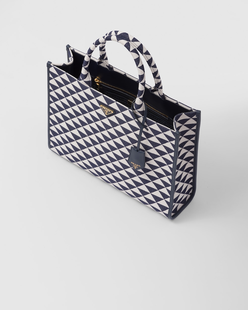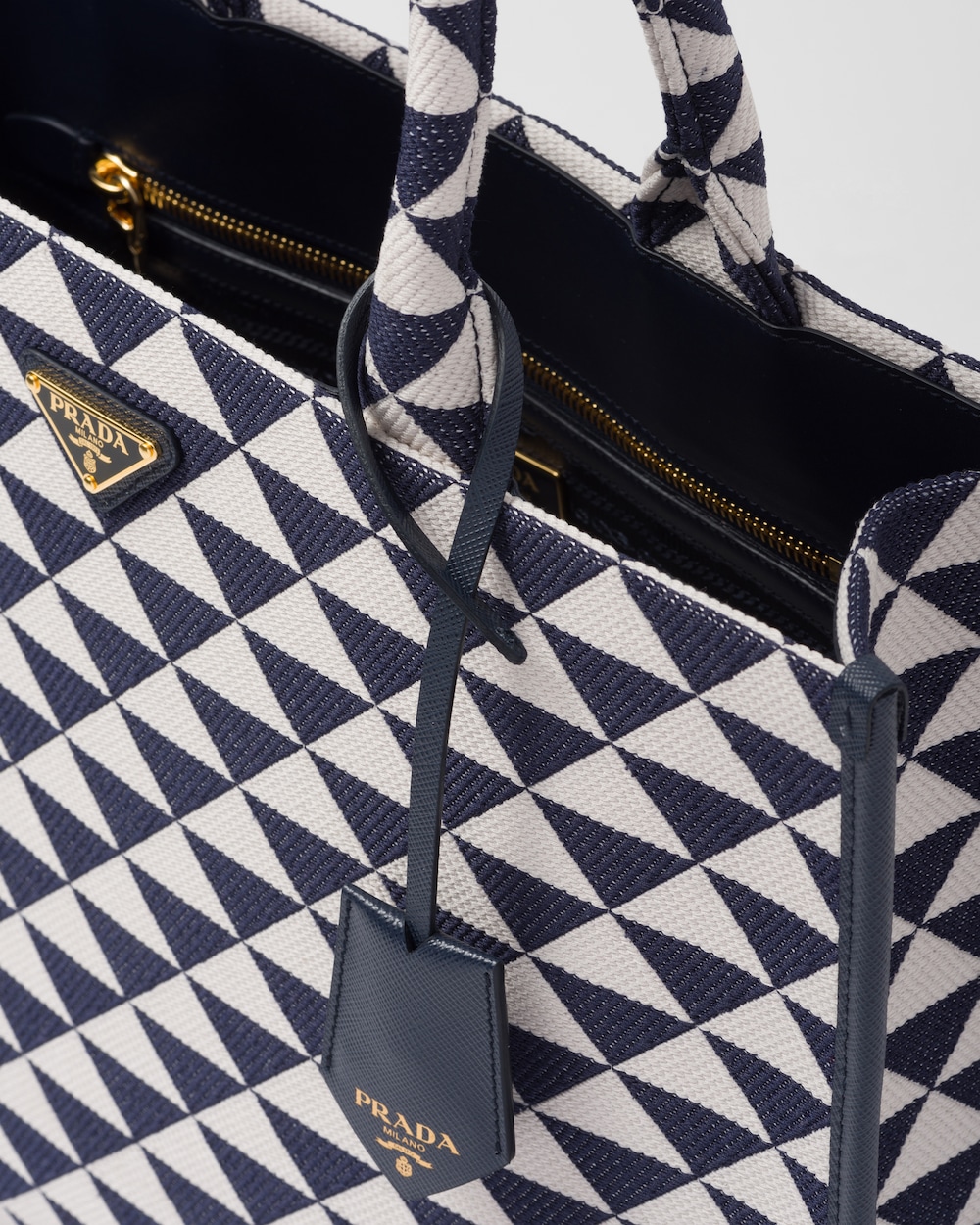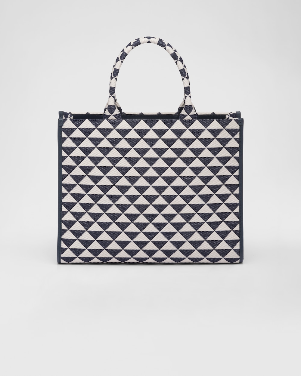 Introduced for the first time on trunks designed by Mario Prada, the Prada triangle expresses uniqueness and modernity through its universal, minimalist shape that is reinvented in a different way each season. Here, the geometric design is transformed into a sophisticated yet modernist pattern that plays with contrasting colors and decorates this sleek tote bag. Details in the brand's iconic Saffiano leather embellish the design.