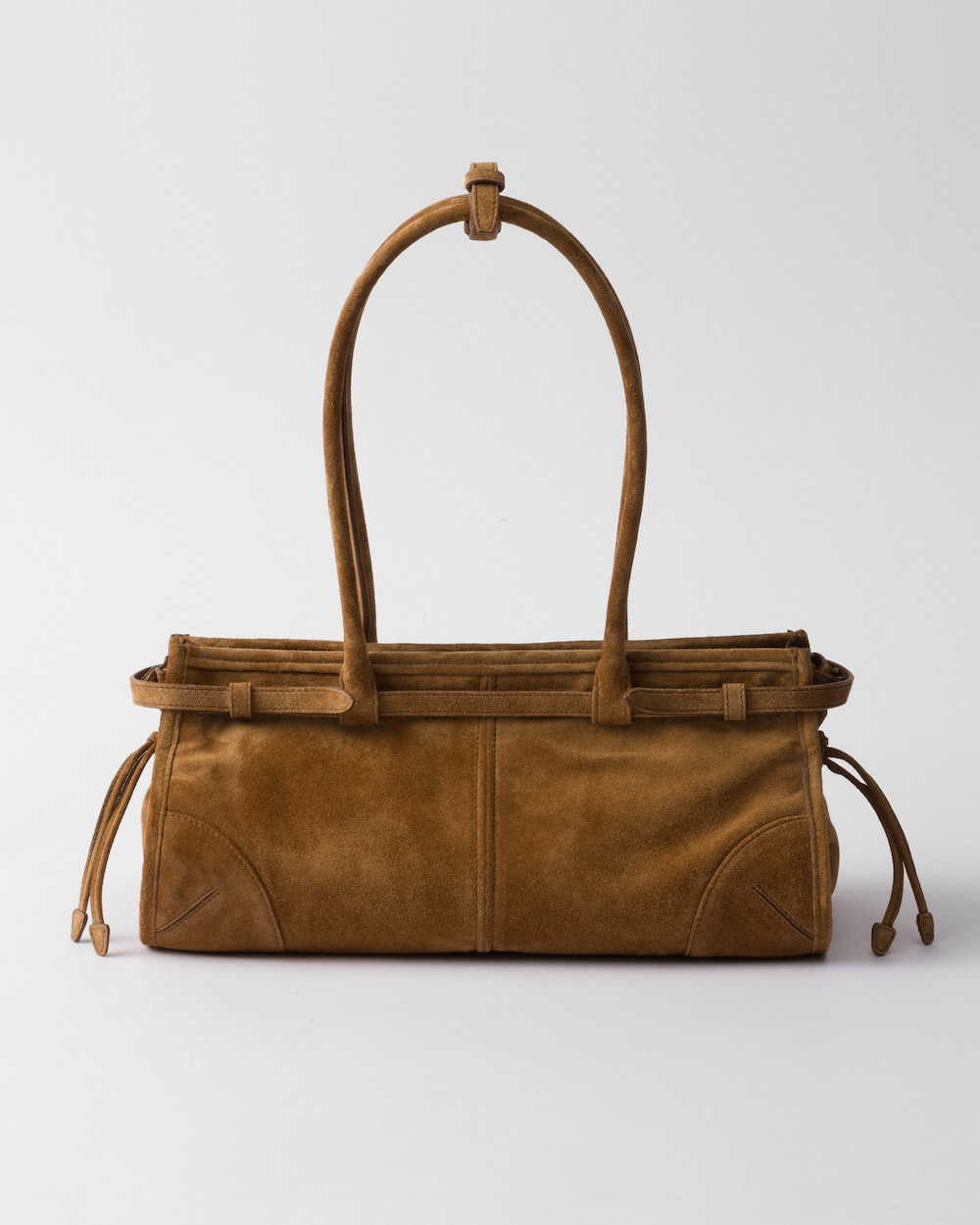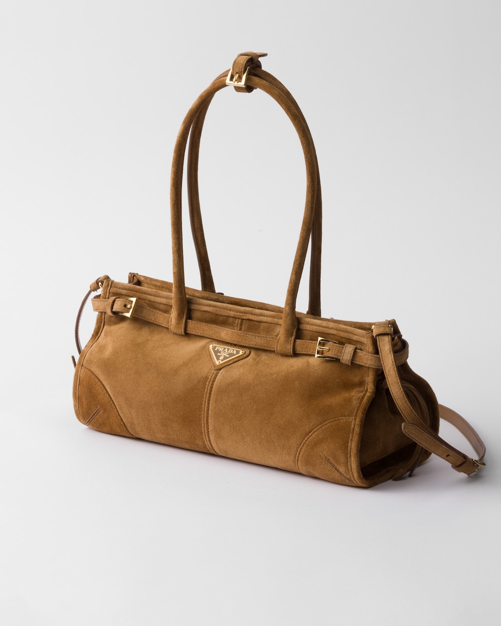 Pragmatic, contemporary elegance defines this suede handbag. The versatile design is enhanced by elegant, flattering straps that enhance the refined simplicity of the style.
