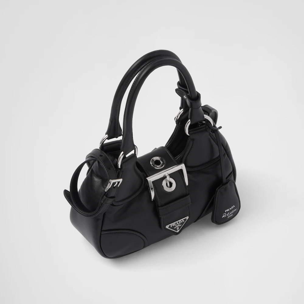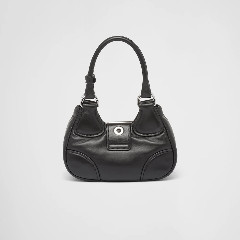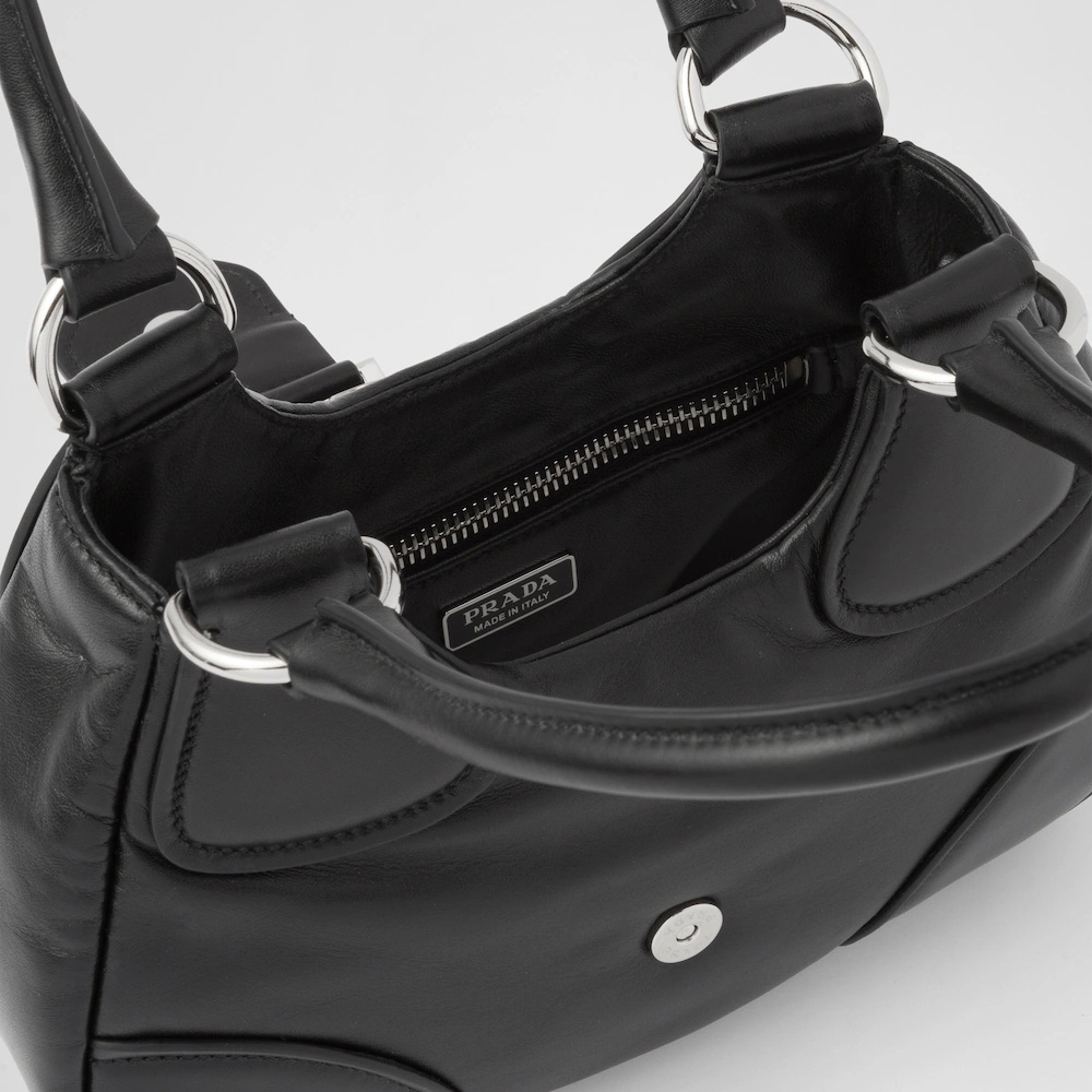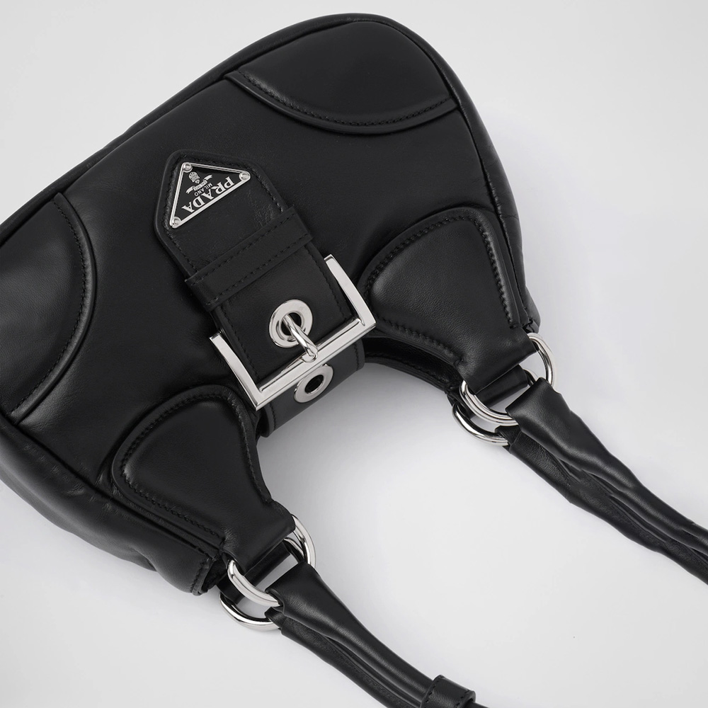 Reimagining the iconic lines of a model from the Prthtada archives from the 2000s, this nappa leather bag combines traditional elements reinterpreting them in a new way, with an innovative soft design. Softness and simplicity of the silhouette define this hobo bag, embellished by the ton-sur-ton triangle logo that frames the lettering logo, creating a three-dimensional and material game and enriching the design of the accessory.